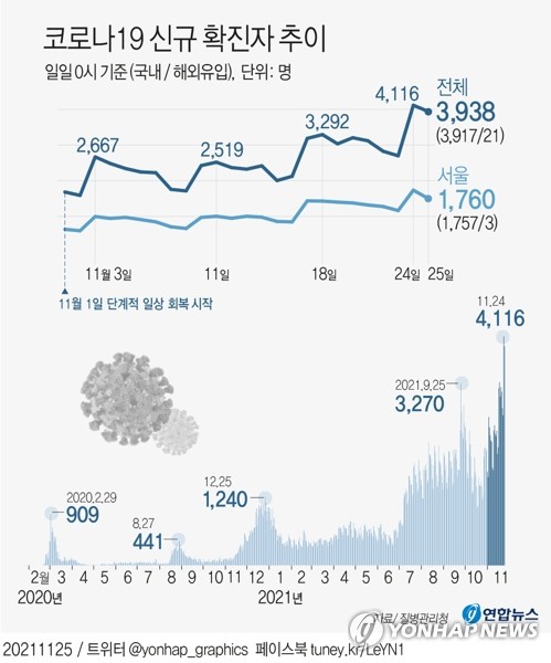 (전국종합=연합뉴스) 황윤정 신선미 정회성 기자 = 단계적 일상회복 전환 이후 코로나19 확산세가 이어지면서 25일 신규 확진자수가 4천명 안팎을 기록할 것으로 예상된다.