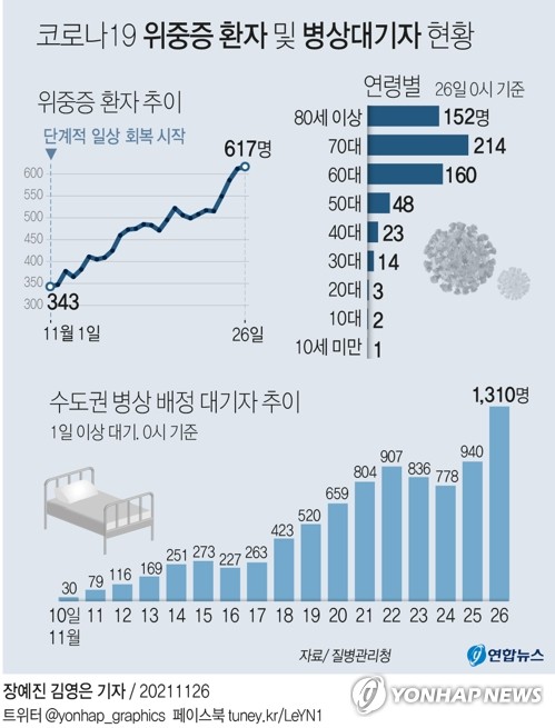 보건복지부 중앙사고수습본부(중수본)에 따르면 이달 1일 단계적 일상회복 전환 당시 '0명'이던 수도권 병상 배정 대기자 수는 날마다 늘어 이날 0시 기준 1천310명으로 나타났다.