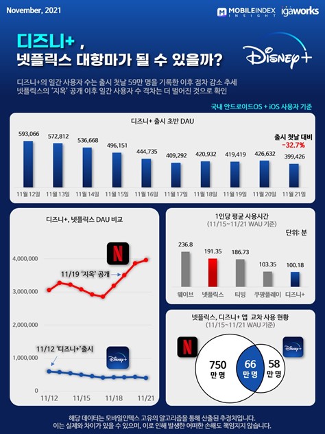 이어 21일에는 39만9천426명을 기록해 출시 첫날 대비 32.7% 감소했다. 이는 같은 날 넷플릭스의 DAU 395만5천517명 대비 9.9%에 불과한 수준이다.