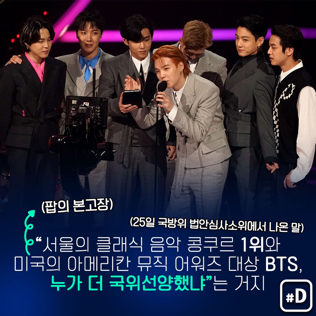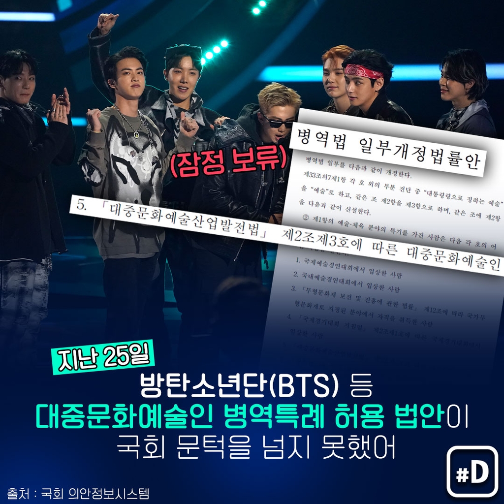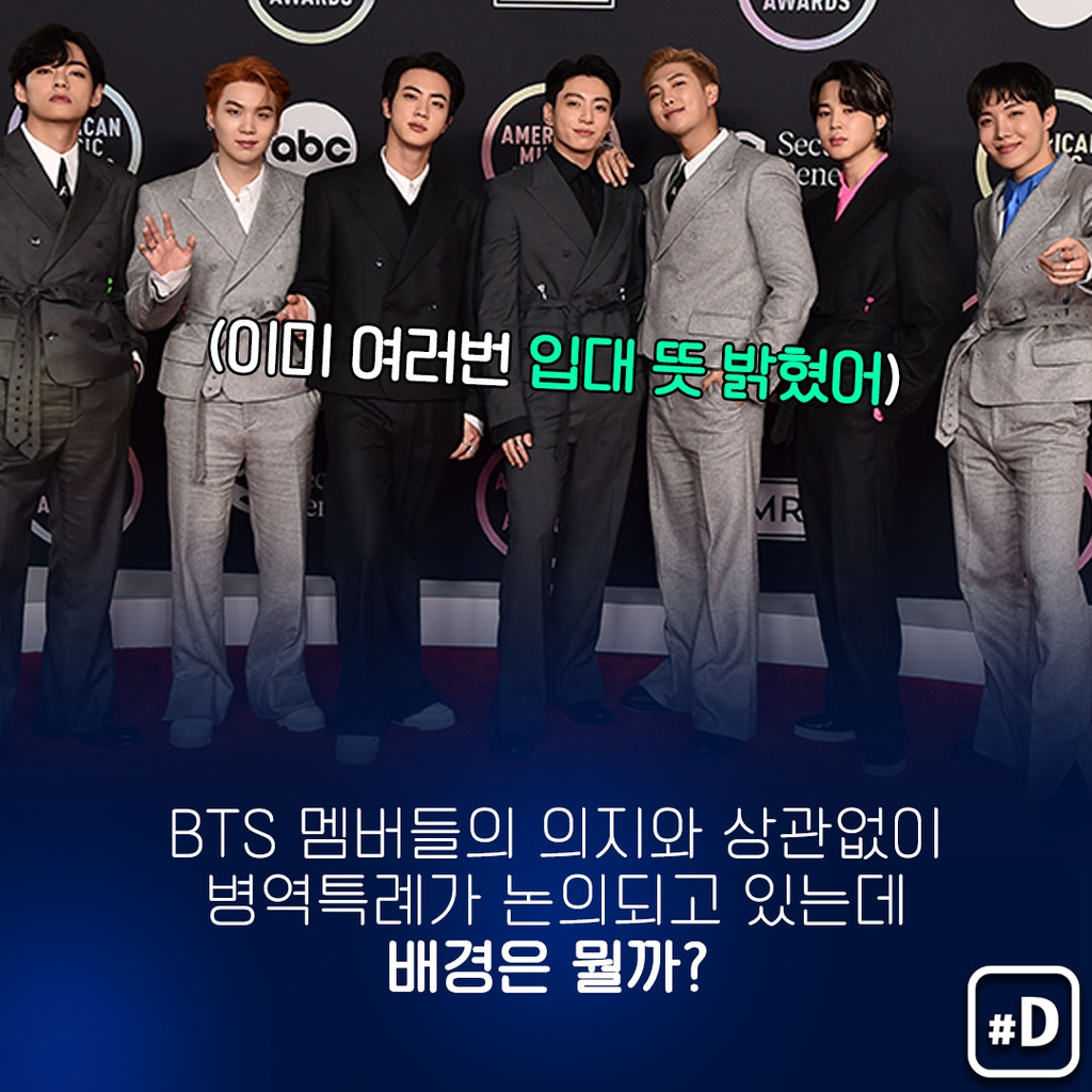 (서울=연합뉴스) 아이돌그룹 방탄소년단(BTS)을 포함해 국익 기여도가 높은 대중문화예술인에 대해 병역특례를 주는 걸 두고 다시 논란이 일고 있습니다.