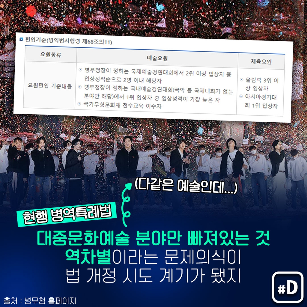 유독 대중문화예술 분야만 빠져 있다 보니 빌보드 차트를 휩쓴 BTS 등이 특례 대상자에서 원천 배제됐고, 이는 형평성에 어긋난다는 지적이 일고 있는데요.