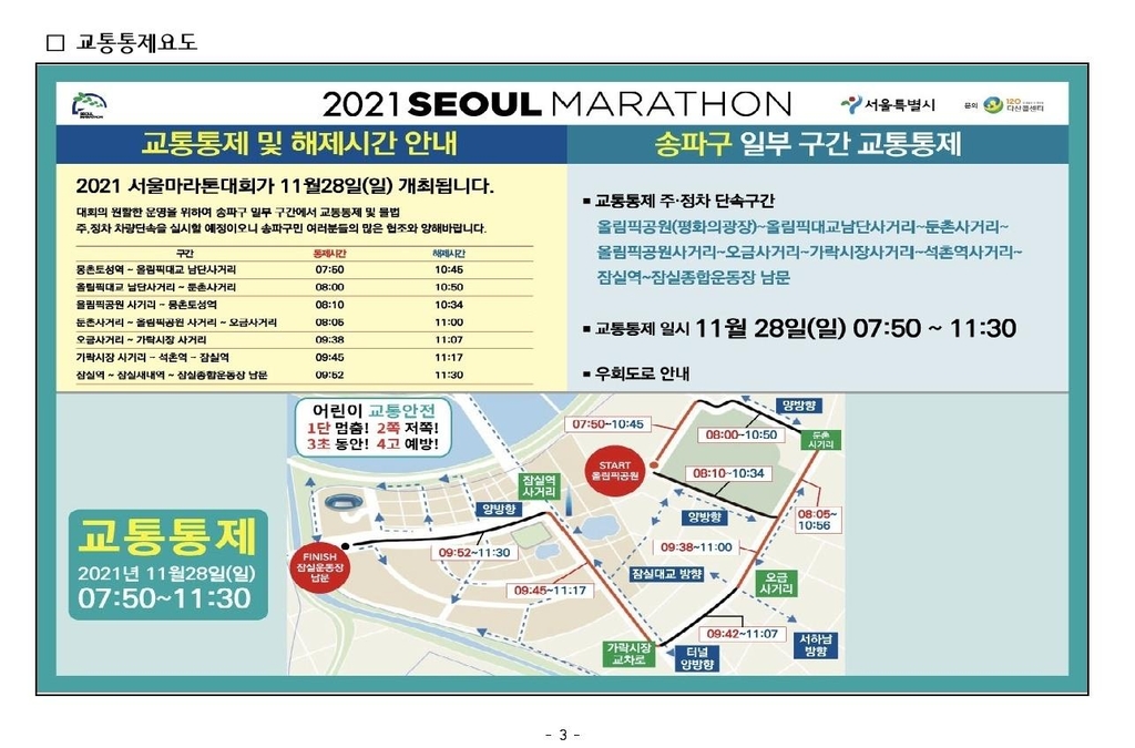 또 오전 7시 35분부터 11시 30분까지 마라톤 코스인 올림픽공원 평화의광장부터 종합운동장까지 진행 방향 2개 차로가 순차적으로 통제 및 해제된다.