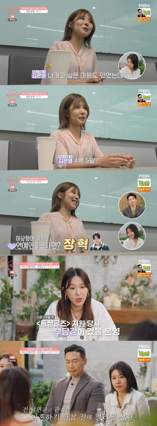 이지혜는 김은영에게 "'돌싱글즈2' 출연이 하기 쉬운 결정은 아니었을 것 같다. 이혼 3개월차면 심리적으로 힘들고 정리도 필요했을텐데 잊어버리려고 나와야겠다는 생각도 들었을 것 같고 어떤 마음이었냐"고 물었다.