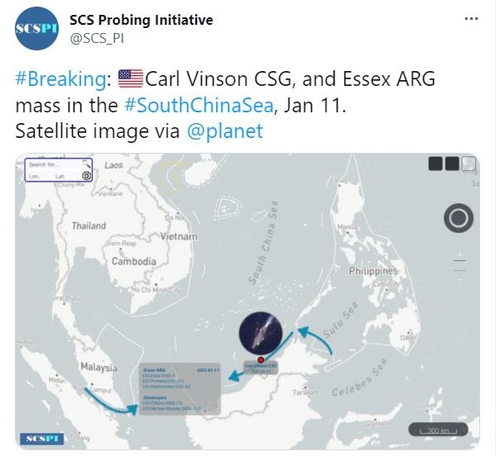 베이징대 싱크탱크인 남중국해전략태세감지계획(SCSPI)은 미국 핵추진 항공모함 칼빈슨호와 강습상륙함 에식스호가 호위함들과 함께 지난 11일 저녁 남중국해 남부 해역으로 진입했다고 밝혔다.