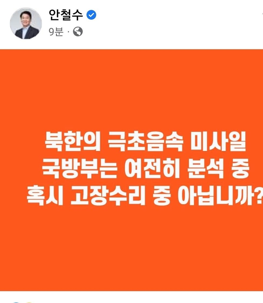 (서울=연합뉴스) 이슬기 기자 = 국민의당 안철수 대선 후보는 15일 북한이 단거리 탄도미사일로 추정되는 발사체 2발을 발사한 것을 두고 "북한의 극초음속 미사일. 국방부는 여전히 분석 중. 혹시 고장 수리 중 아닙니까?"라고 비판했다.