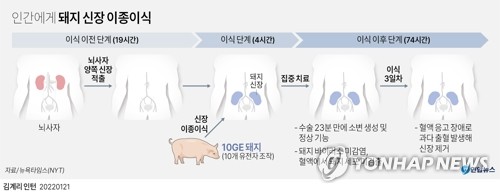 (뉴욕·서울=연합뉴스) 강건택 특파원 김지연 기자 = 미국에서 유전자를 조작한 돼지의 신장을 뇌사자의 체내에 이식하는 수술이 처음으로 진행됐다고 뉴욕타임스(NYT)와 AP통신 등이 20일(현지시간) 보도했다.