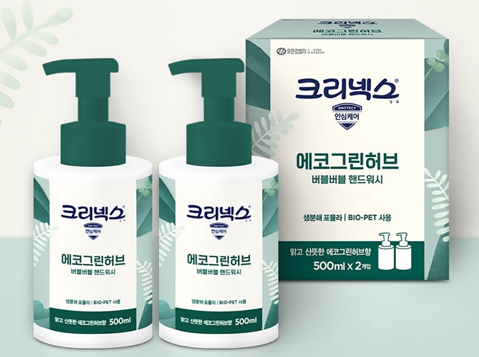 ▲ 유한킴벌리는 수질오염 저감에 초점을 두고 개발한 '크리넥스 버블버블 핸드워시 에코그린허브'를 선보였다. 신제품은 세정 이후 물속에서 생분해되도록 함으로써 수질오염을 최소화해 주는 것이 특징이라고 유한킴벌리는 설명했다.