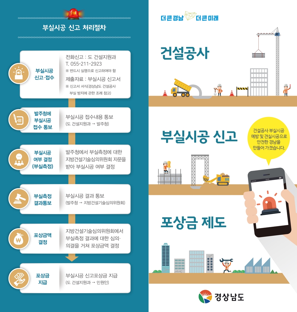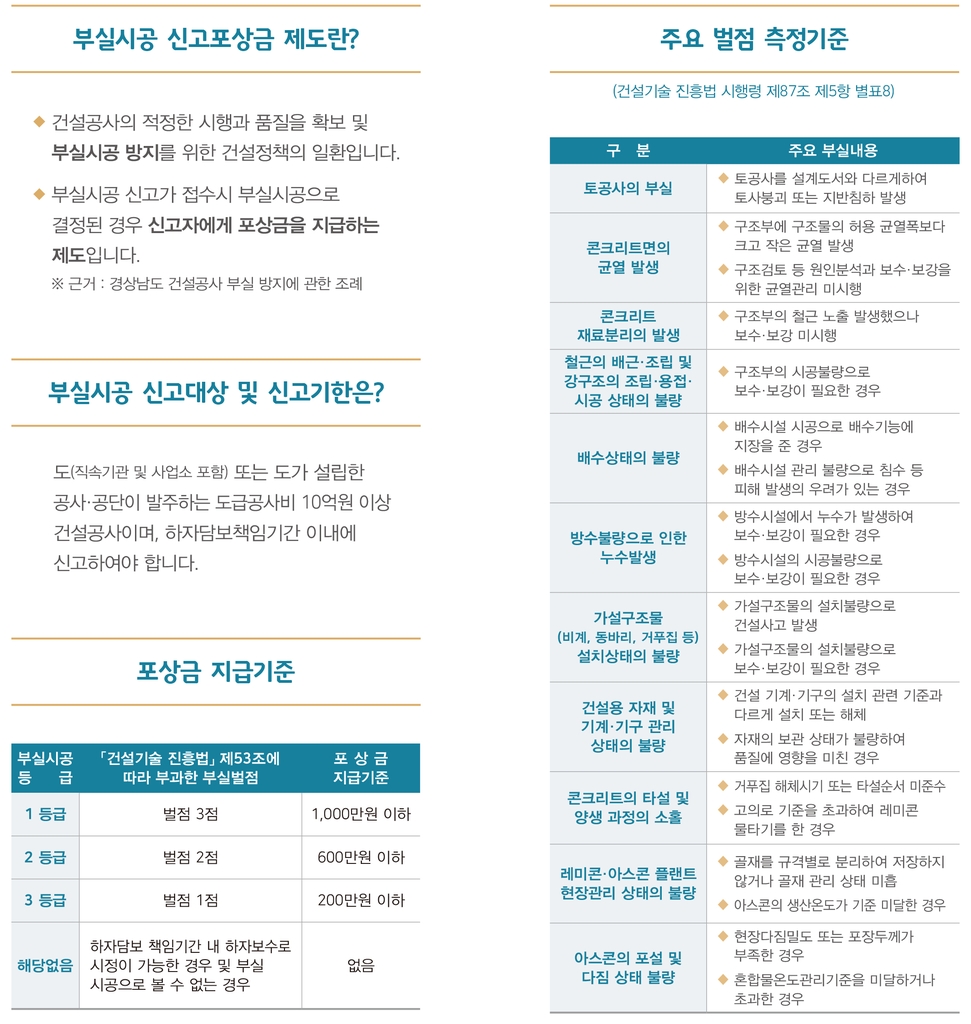 신고가 저조하다고 해서 여태껏 부실시공이 없었다고 단정 짓기도 힘든 데다 만에 하나 안전을 위협하는 부실시공이 이뤄졌을 경우 신고가 원활히 이뤄질 수 있도록 도는 올해 신고 포상금 제도를 적극 알리기로 했다.