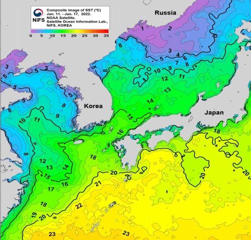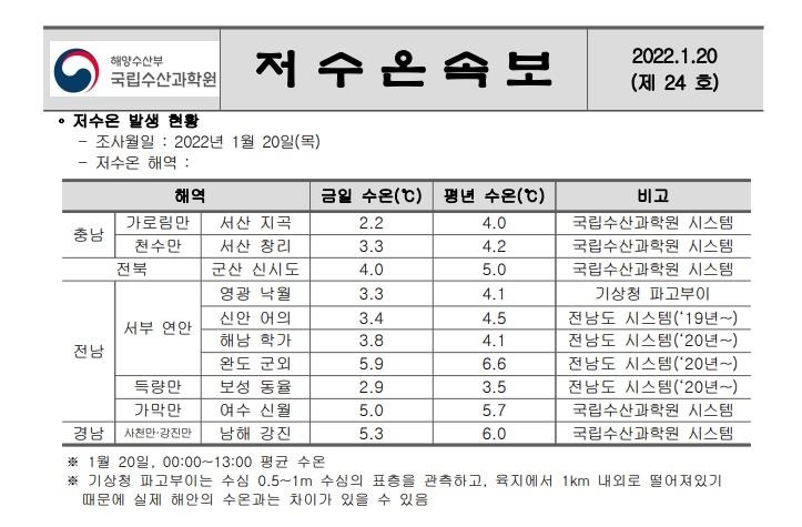 현재 우리나라 서해, 남해 연안과 내만을 중심으로는 해수 온도가 4도 이하일 때 내려지는 저수온 주의보가 발령 중이다.