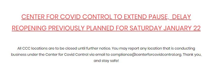 시카고 교외 롤링메도우즈에 기반을 둔 코로나19 검사업체 '센터 포 코비드 컨트롤'(CCC)은 21일(현지시간) 홈페이지에 "22일 다시 문을 열 예정이던 검사소를 별도 공지가 있을 때까지 무기한 폐쇄한다"고 알렸다.