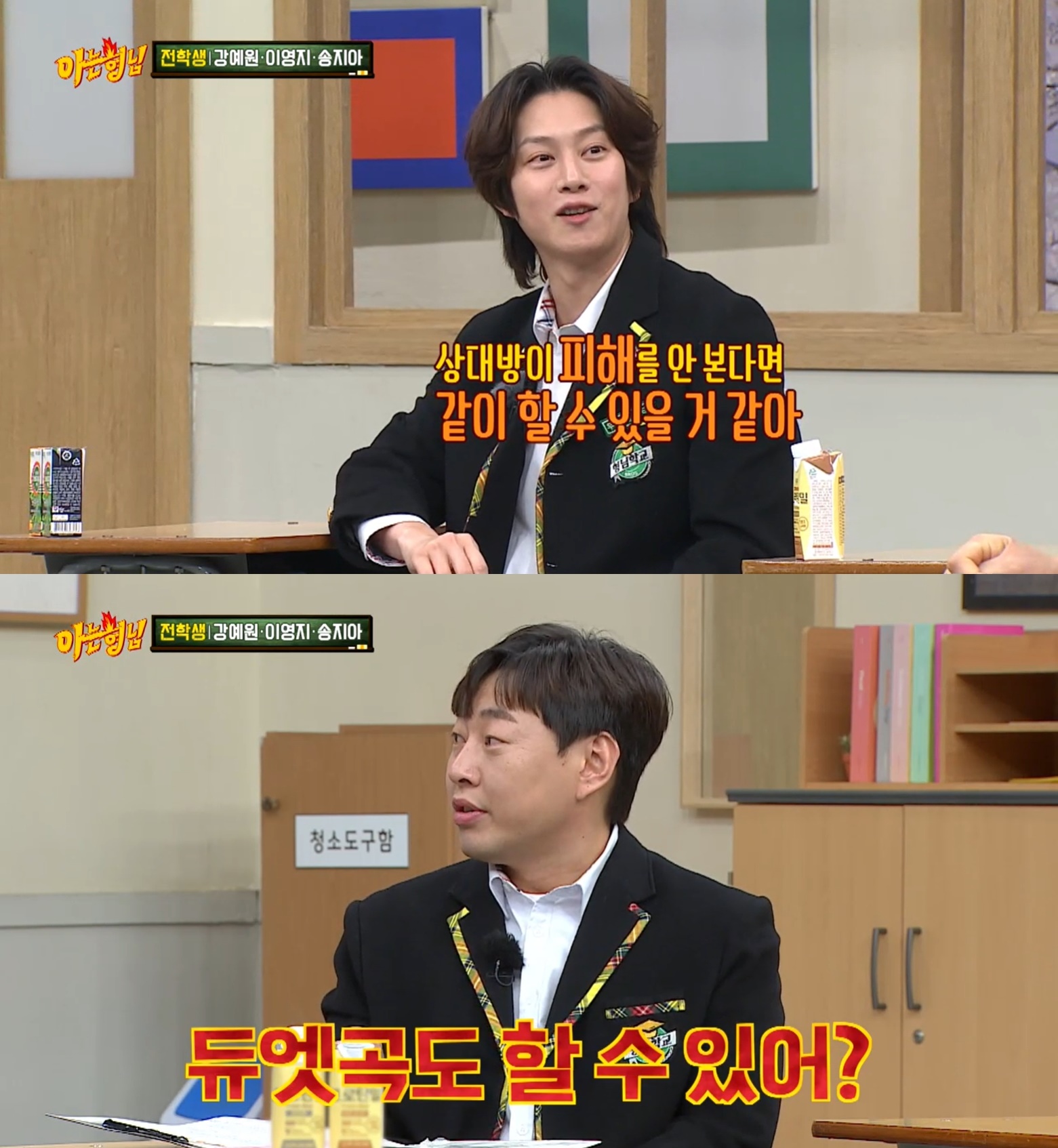 이어 강호동은 김희철에게 같은 질문을 던졌는데, 김희철은 한숨을 내쉰 후 "상대방이 피해를 안 본다면 같이 할 수 있을 것 같다"고 답했다. 이에 이진호가 "듀엣곡도 할 수 있느냐"고 묻자 김희철은 헛웃음을 터뜨리며 "가수가 아닐 수도 있지 않느냐"면서 음료수를 마시려는 모습을 보였다.