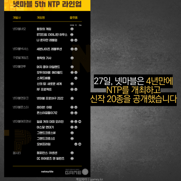 [카드뉴스] 금주의 게임뉴스 탑5 - 넷마블 NTP 신작 20종 공개