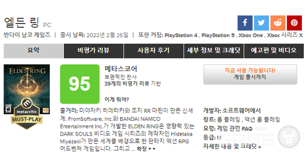 '엘든링' 출시일인 25일 현재 메타크리틱(Metacritic) 평균 점수는 95점이다. 기종별로는 PS5 버전이 97점(총 리뷰 수 47건), XSX버전이 95점 (총 리뷰수 8건), PC버전이 95점(총 리뷰수 39건)을 마크하고 있다. PS4 버전과 Xbox One 버전은 리뷰 수가 없다.