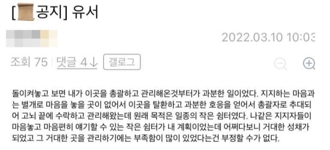 A씨는 전날 오전 10시께 이재명 갤러리에 "영혼 절반이 떨어져 나간 것 같다"며 "이곳을 총괄하는 동안 온갖 음해와 협박에 시달려 그 고통은 이루 말할 수가 없다"는 내용의 유서를 남기고 휴대전화를 끈 채 연락이 두절됐다.
