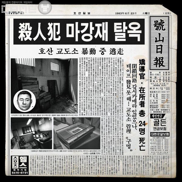 이에 윤태출은 아들의 복수를 위해 마강재의 목에 거액의 현상금을 걸었고, 현상금을 내건 독사파가 앞서 언급된 범죄 신디케이트의 정체다. 이 사주가 호산 교도소 폭동 사건으로 이어지게 되는데, 초기 목적과 달리 해당 사건에서 유일하게 살아남아버린 마강재는 교도관이 녹화 중이던 교도소 CCTV 보안 영상의 단 하나뿐인 사본을 들고 도망쳤다. 이후 이 비디오테이프를 세르게이에게 넘겨주게 된다.