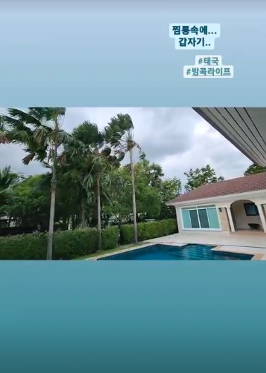 그런가 하면 "찜통 속에 갑자기 #태국 #방콕라이프"라며 수영장을 갖춘 평온한 정원에 바람 불어 나무가 흔들리는 모습을 포착했다.