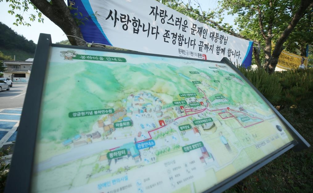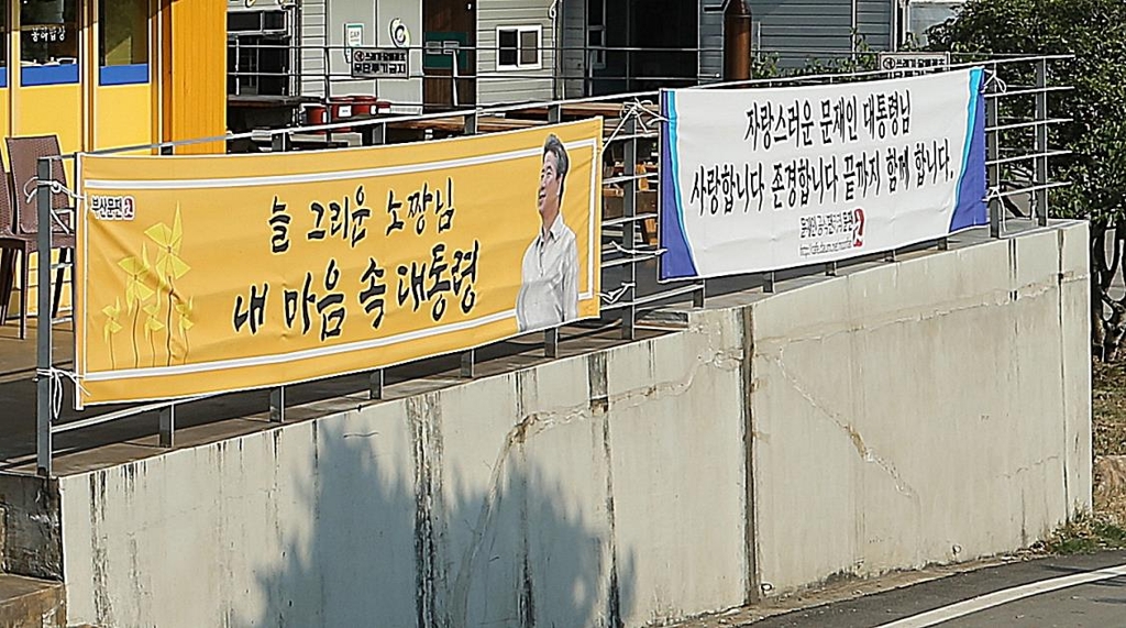 봉하마을과 봉하마을로 향하는 도로, 진영읍 곳곳에서 문 전 대통령 팬카페 '문팬'이 내건 환영 현수막이 내걸렸다.