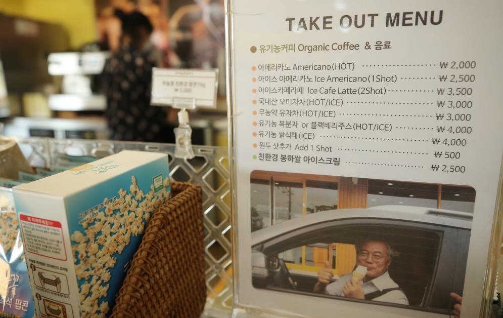 봉하마을 로컬푸드 판매점 내 한 카페는 봉하마을을 찾은 문 전 대통령이 운전석에 앉아 엄지손가락을 치켜세운 채 아이스크림을 맛있게 먹는 사진을 붙이고 아이스크림을 판다.