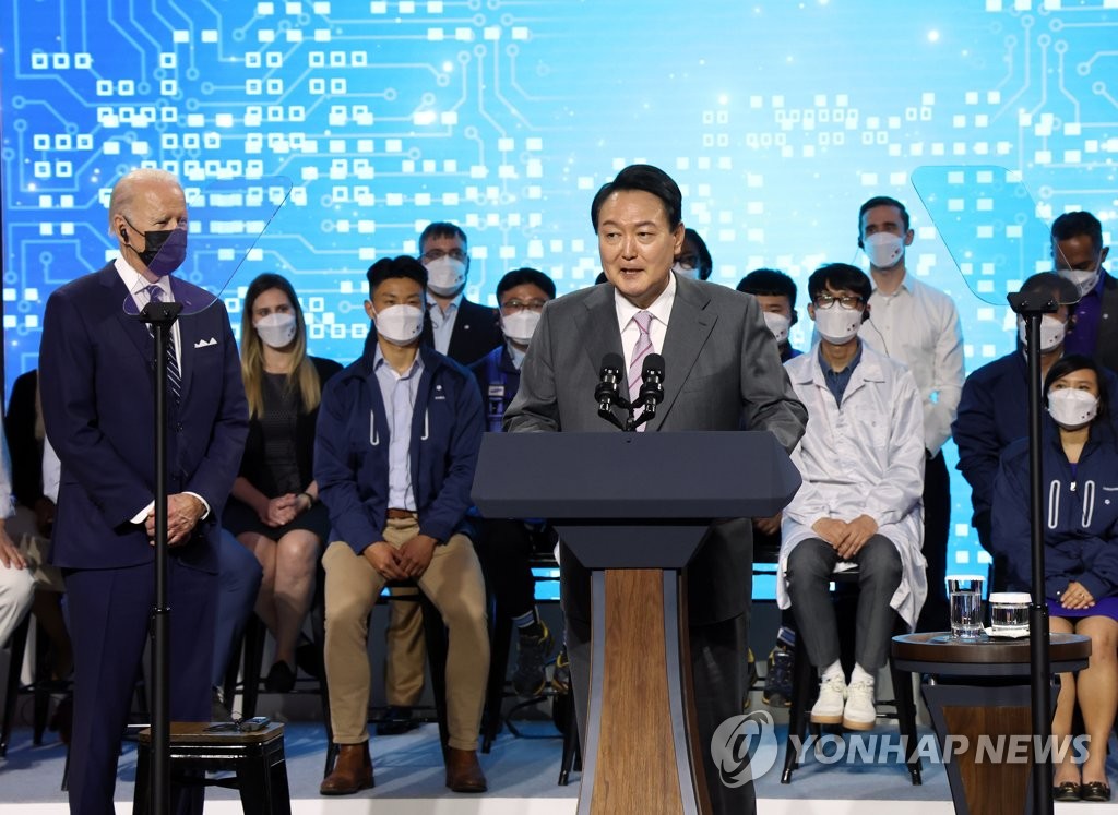 시사>정치[속보] 尹대통령, 바이든에 "반도체, 한미동맹의 핵심"연합뉴스입력 0(평택=연합뉴스) 안정원 기자 = 윤석열 대통령이 20일 오후 한국을 첫 방문한 바이든 미국 대통령과 경기도 평택시 삼성전자 반도체공장 시찰을 마친 뒤 연설하고 있다. 2022.5.20 jeong@yna.co.kr(끝)<저작권자(c) 연합뉴스, 무단 전재-재배포 금지>