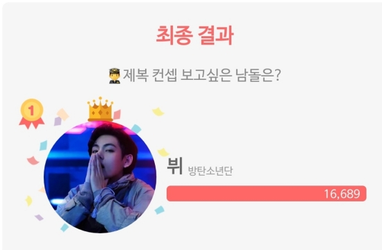뷔는 5월 20일부터 5월 26일까지 아이돌 커뮤니티 최애돌에서 진행된 '제복 컨셉 보고 싶은 남돌은?' 설문에서 1만 6689표를 획득, 1위를 기록했다.