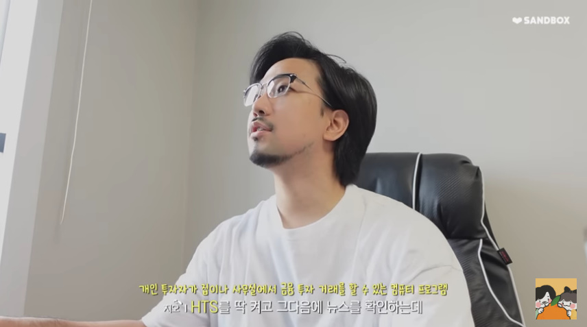 지오는 "컴퓨터로 HTS(개인투자자가 집이나 사무실에서 금융 투자 거래를 할 수 있는 프로그램)를 켜고 뉴스를 확인한다"며 전업투자자의 일상을 공개했다. 이어 그는 "미국 증시가 거의 -5% 가까이 폭락했더라. 오늘은 소심한 매매를 할 예정이다. 무섭기 때문에"라고 투자 계획을 밝혔다.