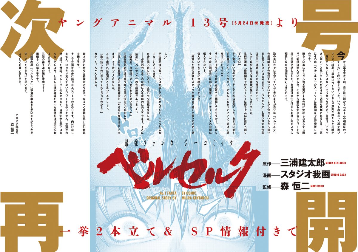 7일 오후 연재처인 영 애니멀은 공식 트위터를 통해 '베르세르크'의 연재를 재개한다고 발표했다. 영 애니멀 편집부는 "‘대베르세르크전’, '영 애니멀 메모리얼호', '베르세르크 단행본 제41권' 등으로 보내주신 여러분의 메시지를 최대한 많이 읽어보았다"면서 " 여러분이 베르세르크에서 얼마나 많은 영향을 받으셨고 베르세르크를 얼마나 사랑해 주셨는지 마음으로 느낄 수가 있었다. 그러나 이런 메시지를 읽을 미우라 켄타로 선생님 본인이 안 계신다는 점이 매우 안타깝다"고 전했다.