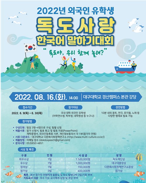 (서울=연합뉴스) 이상서 기자 = 대구대와 독도재단은 국내 대학교에 다니는 외국인 유학생을 대상으로 '2022 외국인 유학생 독도 사랑 한국어 말하기 대회'를 개최한다고 13일 밝혔다.