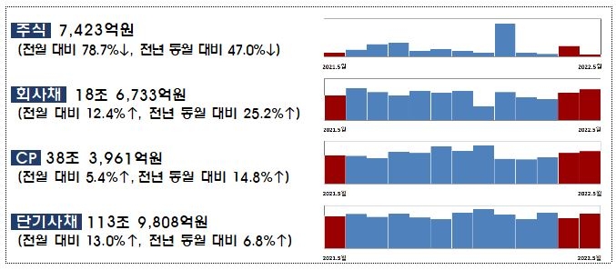 CP 발행 규모는 38조3천961억원으로 14.8%, 단기사채 발행액은 113조9천808억원으로 6.8% 늘었다.
