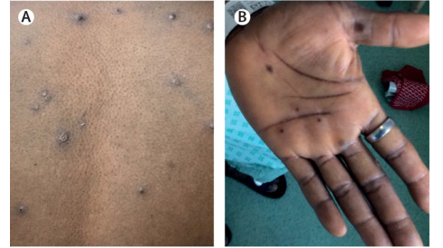 ▲ 사실 원숭이두창과 수두의 피부병변은 여러 가지 측면에서 유사하다. 공통적으로 발열이 있는 두통, 근육통, 요통, 권태감 등의 전구증상이 나타난 지 2~3일 후에 발진이 시작되고, 발진이 변화하는 것도 비슷하다. 다만, 림프절 비대가 원숭이두창에서는 특징적으로 잘 관찰되지만, 수두에서는 흔하지 않다. 또 원숭이두창에서는 손발바닥의 피부병변이 75%의 환자에서 관찰될 정도로 흔하지만, 수두는 그렇지 않다. 원숭이두창은 반점→수포→농포→딱지 순서로 변하는 피부병변의 변화가 비슷하게 일어나 유사한 모양의 병변을 보이지만, 수두에서는 병변의 변화 시점이 서로 달라 다양한 양상의 병변이 관찰된다는 점도 다르다.