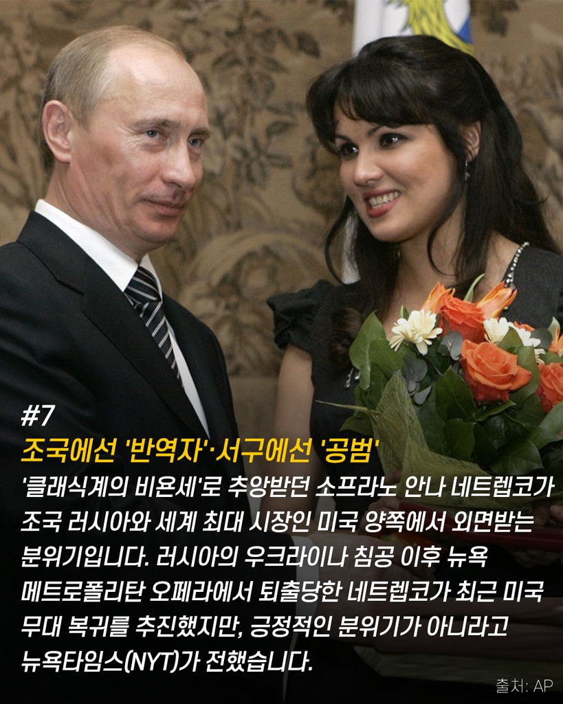 '클래식계의 비욘세'로 추앙받았던 소프라노 안나 네트렙코가 조국 러시아와 세계 최대 시장인 미국 양쪽에서 외면받는 분위기입니다. 러시아의 우크라이나 침공 이후 뉴욕 메트로폴리탄 오페라에서 퇴출당한 네트렙코가 최근 미국 무대 복귀를 추진했지만, 긍정적인 분위기가 아니라고 뉴욕타임스(NYT)가 전했습니다.