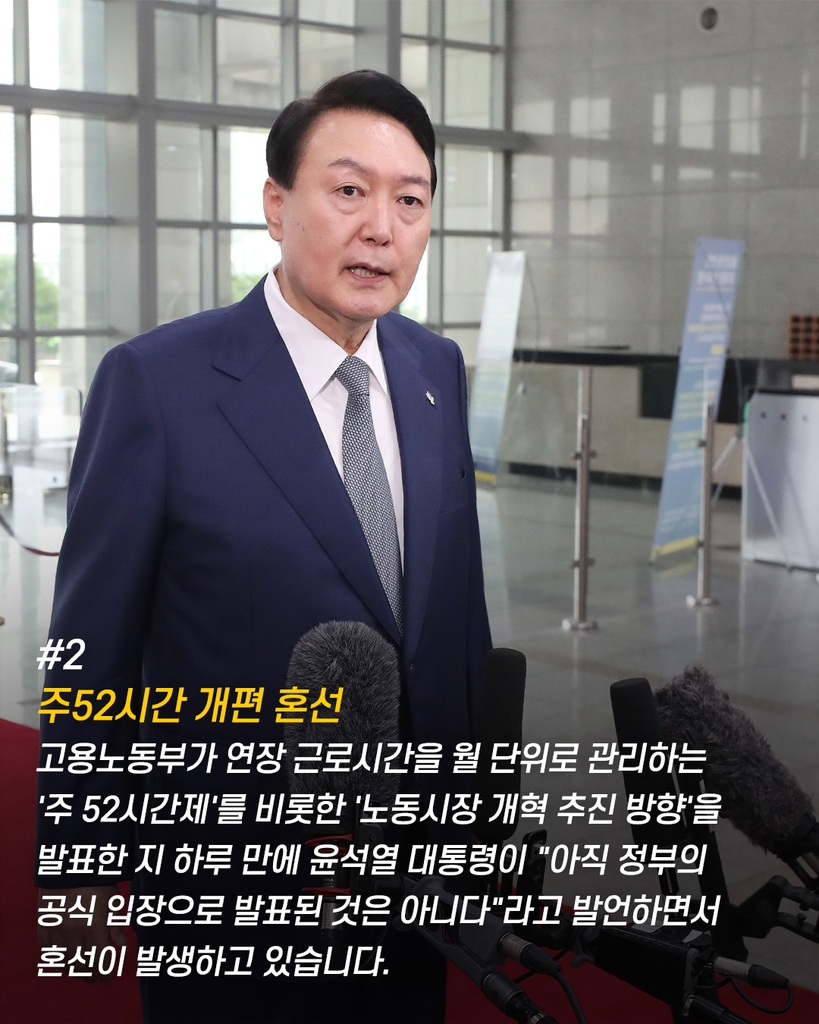 고용노동부가 연장 근로시간을 월 단위로 관리하는 '주 52시간제'를 비롯한 '노동시장 개혁 추진 방향'을 발표한 지 하루 만에 윤석열 대통령이 "아직 정부의 공식 입장으로 발표된 것은 아니다"라고 발언하면서 혼선이 발생하고 있습니다. ☞ 관련 기사 더 보기[http://www.yna.co.kr/view/AKR20220624038951001]