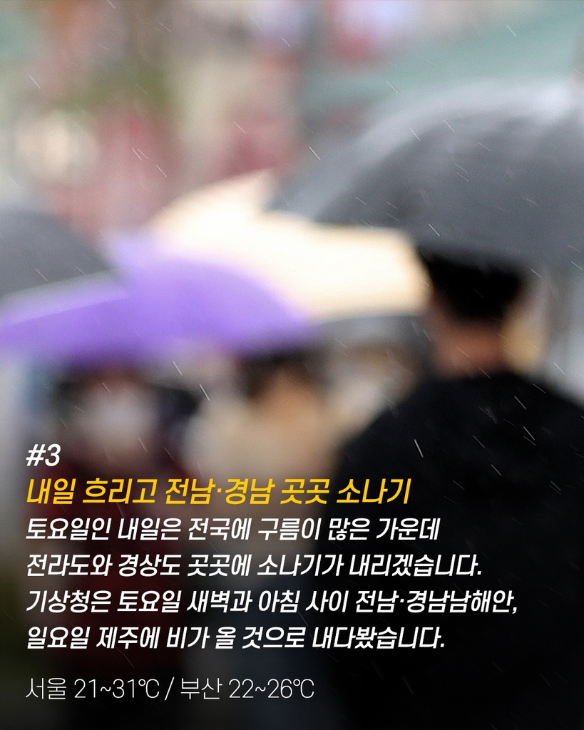 ● 내일 흐리고 전남·경남 곳곳 소나기…서울 낮 최고 31도[http://www.yna.co.kr/view/AKR20220624019400004]