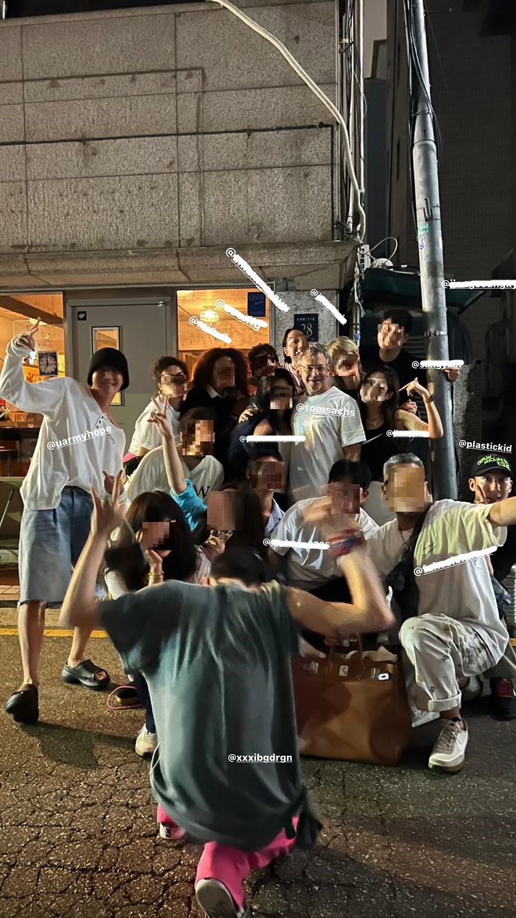 앞서 제이홉, 슈가, 지드래곤, 티아라 출신 효민 등은 톰 삭스의 전시회에 방문해 사진을 남긴 바 있다. 톰 삭스와 디너 파티를 즐기기 위해 이렇게 많은 이들이 모인 듯 하다.