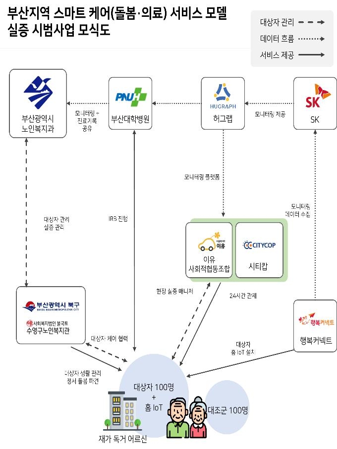 시는 지난해 부산대병원, 이유사회적협동조합, SKT, 행복커넥트, 허그랩, 시티캅 등과 협력 체계를 구축하고 부산 북구와 수영구의 홀몸 어르신 100명의 주거지에 레이더 센서, 스마트 밴드, 인공지능 스피커, 문 열림 센서 등을 설치했다.