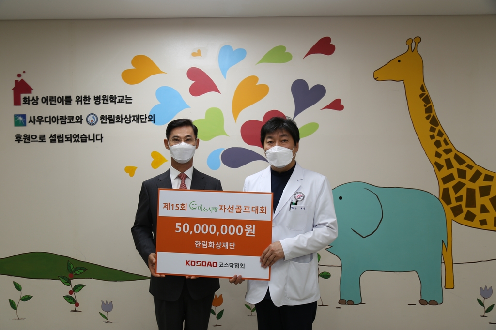 ▲ 코스닥협회는 '제15회 미소사랑자선골프대회'를 통해 모금된 2억8천500만원을 한림화상재단, 서울성모병원, 서울특별시어린이병원, 서울대어린이병원 등 12개 단체에 전달했다고 6일 밝혔다. 2006년 시작된 미소사랑자선골프대회는 행사 수익금 전액을 소외계층 어린이 환우의 수술비 마련 및 청소년 관련 사회복지단체 후원에 사용한다. (서울=연합뉴스)