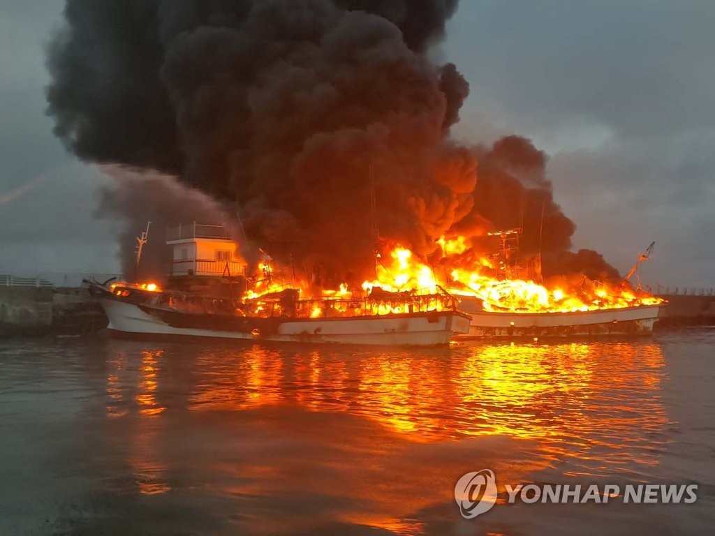 시사>사회[1보] 제주 성산항 어선 화재 방화 피의자 긴급체포연합뉴스입력 0(서귀포=연합뉴스) 4일 오전 제주 서귀포시 성산읍 성산항에 정박 중인 연승어선 3척에 불이 나고 있다. 2022.7.4 [서귀포해양경찰서 제공. 재판매 및 DB 금지] dragon.me@yna.co.kr(끝)<저작권자(c) 연합뉴스, 무단 전재-재배포 금지>