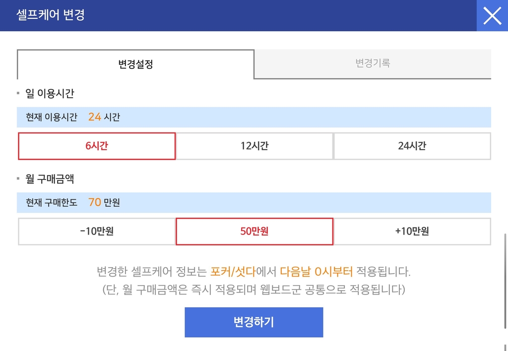 이용자가 설정한 시간이 경과되면 해당 날짜의 게임 이용이 제한되며, 손실 한도에 도달해도 6시간 동안 게임 접속을 할 수 없다. 구매 한도는 10만 원 단위로 월 최대 3번까지 바꿀 수 있다.
