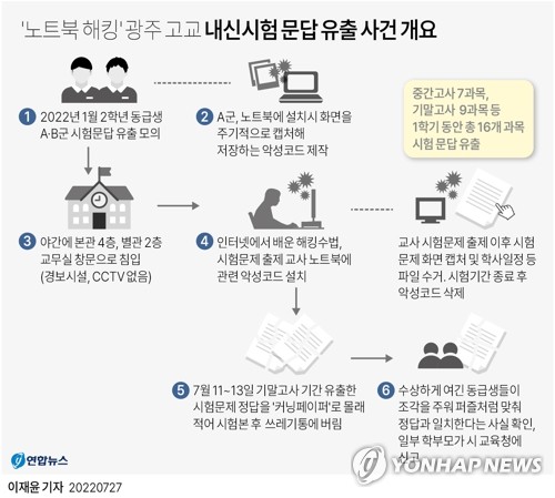 (광주=연합뉴스) 전승현 박철홍 정회성 기자 = 광주 대동고등학교 2학년 1학기 내신시험 문답 유출 사고는 올해 중간고사부터 연이어 발생한 것으로 경찰 수사에서 드러났다.
