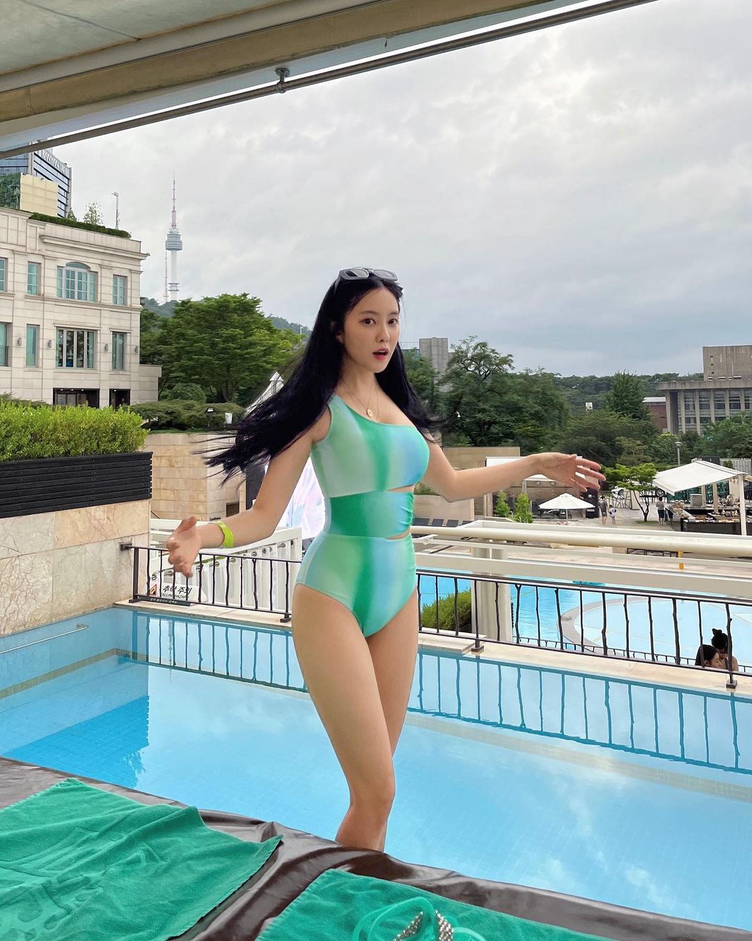 사진 속 효민은 수영장에서 민트 컬러의 수영복을 입고 화려한 주얼리를 착용한 채 포즈를 취하고 있다.