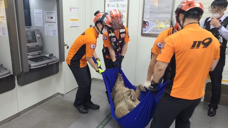 소방 관계자는 "ATM 부스 출입문이 밖에서 밀고 들어가고 안에서 나올 땐 당겨야 하는 문이라, 멧돼지가 밀고 들어간 다음 나오지 못하고 갇힌 것으로 보인다"고 말했다.