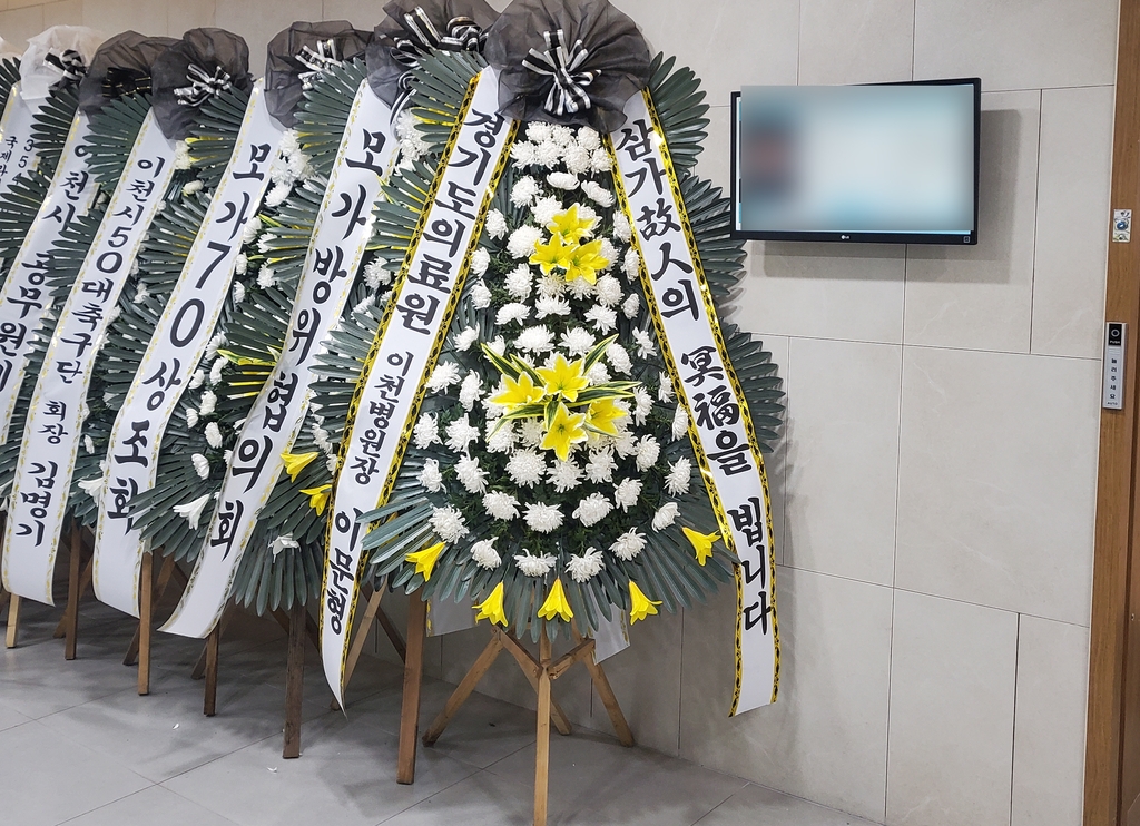 장례식장 복도에는 김동연 경기도지사, 김경희 이천시장, 이기일 보건복지부 2차관 등이 보낸 많은 조기와 조화가 놓여 있었다.