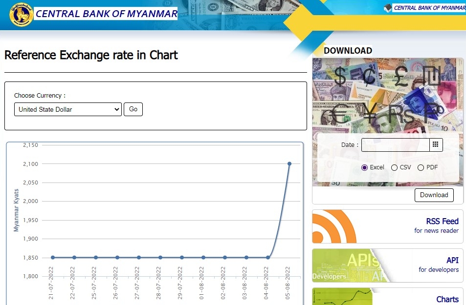 중앙은행은 이날 공고에서 달러당 고정환율을 1,850짯에서 2,100짯으로 올리고, 수출기업 통장에 입금된 달러의 강제 환전 비율도 100%에서 65%로 낮춘다고 밝혔다.
