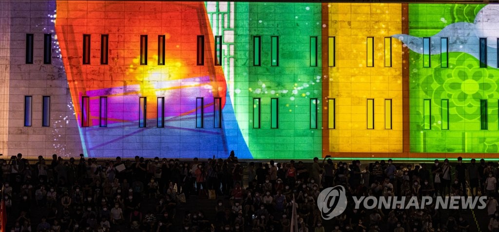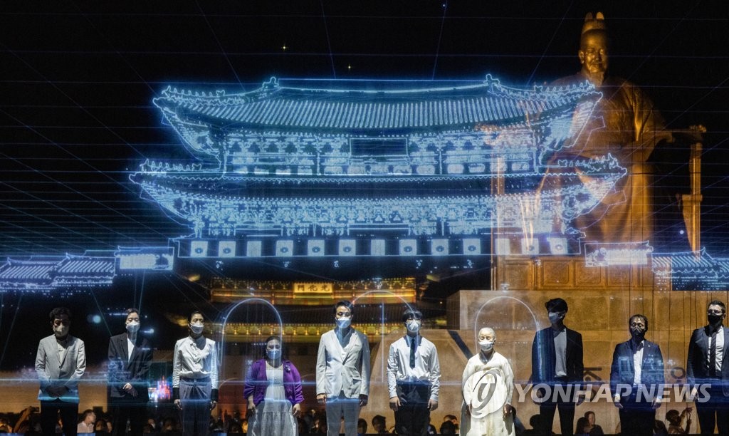 (서울=연합뉴스) 김준태 기자 = 6일 시민의 품으로 다시 돌아온 광화문광장에서 '빛과 화합'을 주제로 기념행사가 열렸다. 화려한 조명과 아름다운 오케스트라 선율이 도심의 여름밤을 물들였다.