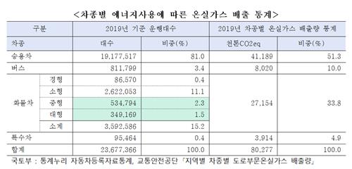화물차의 경우 보유대수는 2019년 기준 전체 차량대수의 15.2% 정도지만 주행거리가 길고 경유차 비중이 높아 이산화탄소 발생 비중은 33.8%에 달하고 미세먼지는 총배출량 중 75.5%를 차지하고 있다.