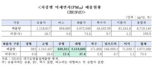 이중 중·대형 화물차의 경우도 보유대수는 3.8%에 불과하지만 미세먼지 배출량 중 49.7%를 배출하고 이산화탄소 및 미세먼지 배출량은 1t 트럭 대비 각각 12.3배, 17배를 넘는 것으로 나타났다.
