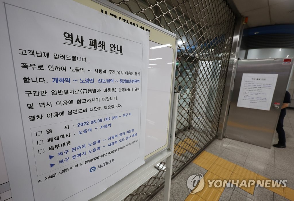 9호선은 8일 오후 10시께 동작역과 구반포역의 선로 침수로 노들역∼사평역 사이 총 7개 역(노들·흑석·동작·구반포·신반포·고속터미널·사평)에서 열차가 운행하지 않다가 14시간 후인 다음날 오후 2시부터 전 구간 운행이 재개됐다.
