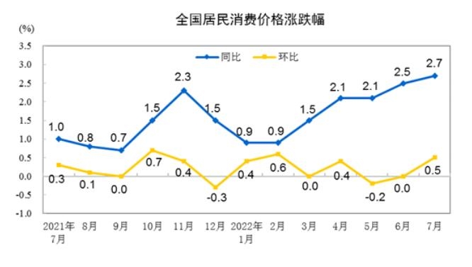 10일 중국 국가통계국에 따르면 중국의 7월 소비자물가지수(CPI)는 작년 같은 달보다 2.7% 상승했다.