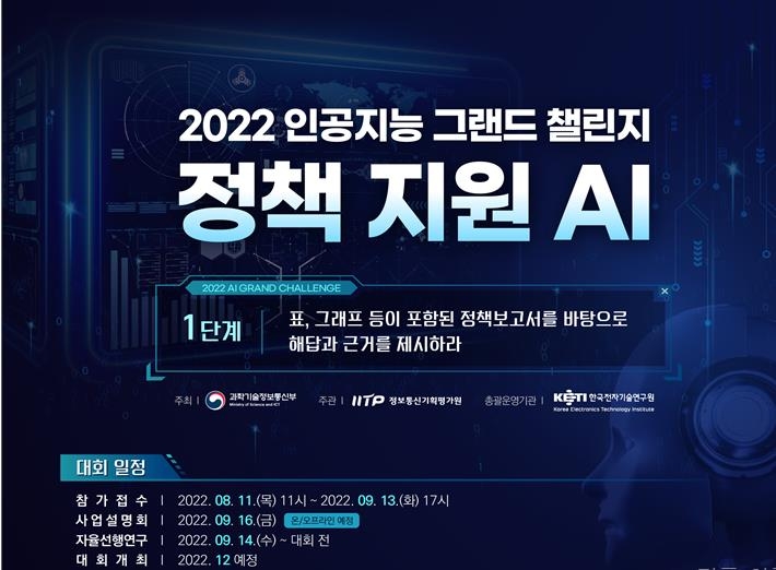 (서울=연합뉴스) 최현석 기자 = 과학기술정보통신부(과기정통부)는 11일부터 다음 달 13일까지 인공지능(AI) 연구개발 경진대회인 '인공지능 그랜드 챌린지: 정책지원 인공지능' 참가팀을 모집한다고 10일 밝혔다.