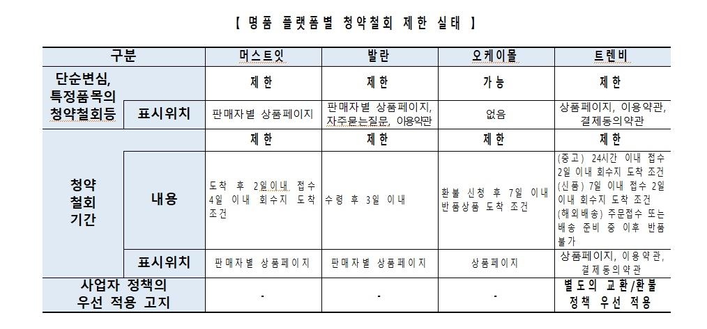 또 조사대상 업체 모두 청약 철회 기간이 법정 기간(수령 후 7일 이내)보다 짧거나 특정 단계(주문 접수 또는 배송 준비 중) 이후에는 철회할 수 없었고, 일정 기간 내 반품 물건이 도착해야만 철회해줬다.