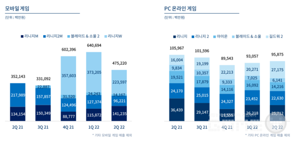 PC온라인 게임 매출은 리니지 257억 원, 리니지2 226억 원, 아이온 142억원, 블레이드 & 소울 61억 원, 길드워2 272억 원이다.